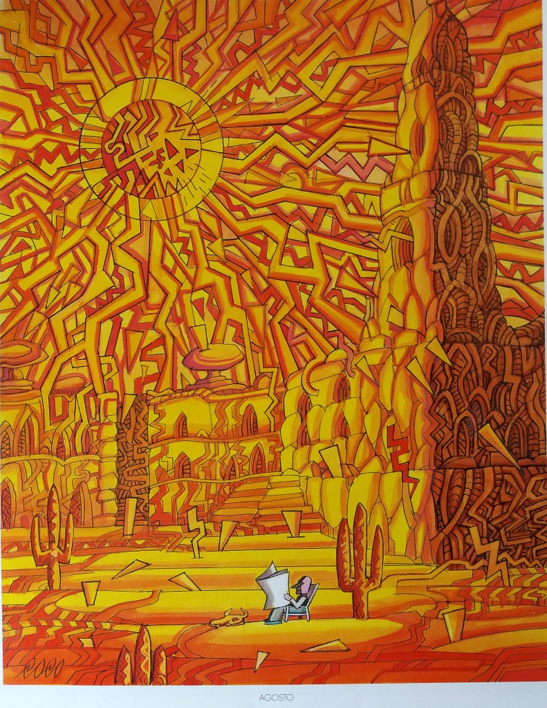 Così il solitario lettore nella piazza, nascosto dietro ad un giornale, dove il solleone ha infuocato il basolato e fatto fondere perfino il campanile uccidendo i colombi che qui ne hanno la residenza, i quali cadono a terra quasi arrostiti dalla gran calura, tra enormi cactus che simboleggiano l’estremo isolamento.