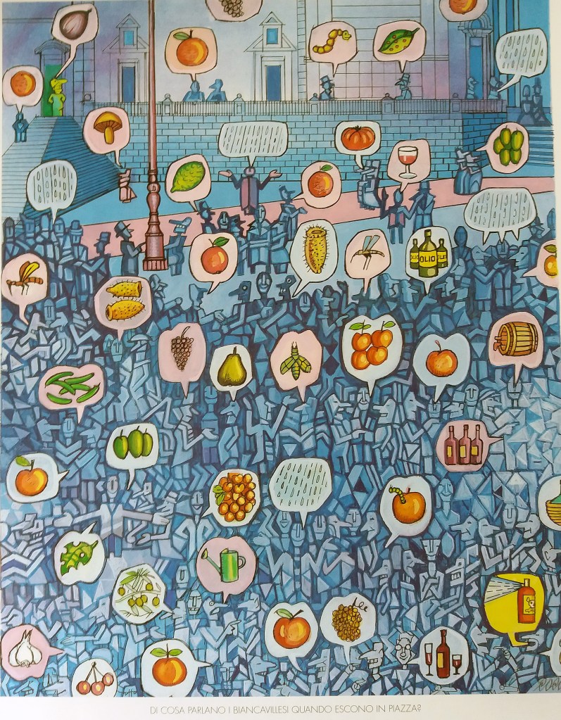 Ma di cosa parlano i biancavillesi mentre si auto analizzano? L’argomento è uno e uno solo, anche se con tante variabili o capitoli o settori: l’arte più antica e appassionante dell’uomo, l’agricoltura. Contadini, operai, impiegati, professionisti, scrittori, poeti, pittori, tutti, tutti si appassionano alla coltivazione della terra. Ognuno porta la sua esperienza di agrumicoltore, di viticoltore, di olivicoltore, di esperto in ortaggi o in alberi da frutta; ognuno ha una sua personale soluzione per sgominare i parassiti; qualcuno usa in maniera massiva diserbanti e antiparassitari, altri sono per una agricoltura biologica. Tutti sono d’accordo che un bracciante non si può pagare così come vuole lo Stato: costerebbe troppo! Qualcuno propone di assumere come mano d’opera i rumeni, altri i marocchini o gli albanesi. Poi soddisfatti, ma con un po’ di languore allo stomaco, guardano in alto all’orologio del loro campanile. Sì, è ora di rincasare e cominciano a scemare. La terapia per quel giorno è finita, e tranquilli, rasserenati ma con un inspiegabile senso di vuoto (lo stesso che provano ogni sera percorrendo la strada verso casa) si avviano soddisfatti ciascuno al loro focolare.