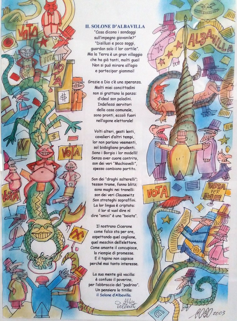 Presentiamo la tavola “Natale” e una illustrazione ad un mio componimento, “Il solone d’Albavilla”, che nel 2003 Coco realizzò poiché, mi disse, il testo lo stimolava alquanto.
