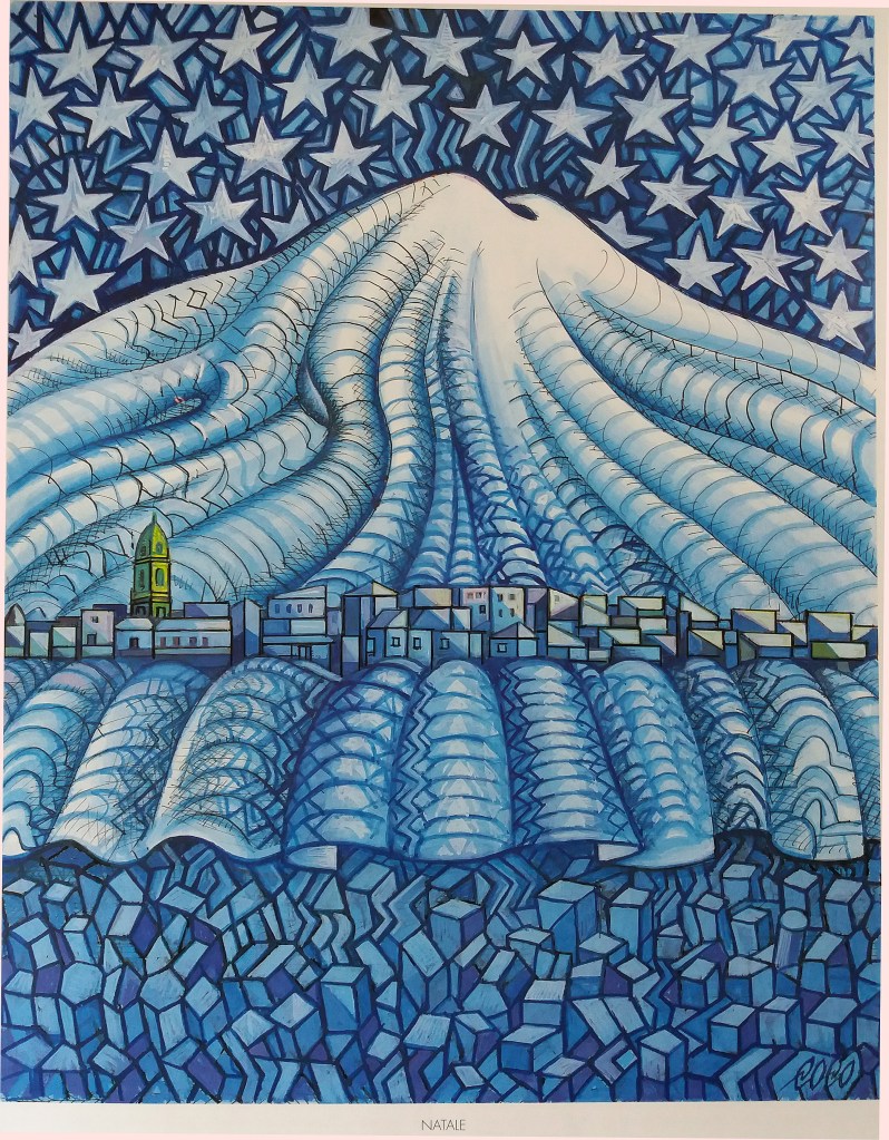 Superba questa tavola con cui si presenta il Natale, l’Evento più importante, insieme alla Pasqua, per la Cristianità. Nel disegno non appare nessun simbolo che possa richiamare la nascita di Gesù, sembra piuttosto richiamare, con la sua personale tecnica surrealista, un paesaggio invernale, oppure un’originale presentazione del vulcano che da sempre accoglie gli opposti: caldo e freddo, fuoco e gelo.